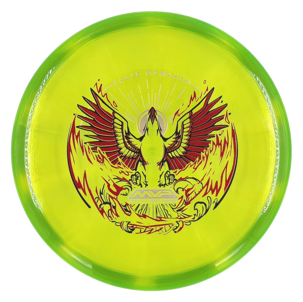 Like a phoenix rising from the ashes, Eagle McMahon’s first Official Team Series disc fully embraces the idea of new beginnings and the fire that burns within. Suitably named “Rebirth”, Mike Inscho has beautifully illustrated Eagle’s first triple-foil stamp, featuring an eagle rising from the ashes on his personal mold of choice, the Prism Proton Envy. Don’t miss your chance to snag the very first of what is sure to be a long line of discs that directly support Eagle!