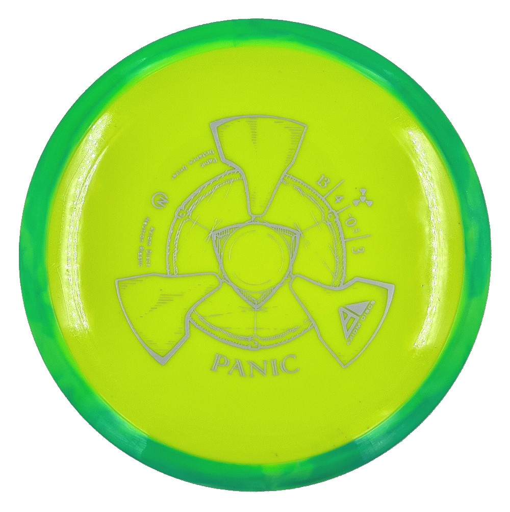 The Panic is thoroughly overstable, with plenty of beef to handle headwinds and torqued-up sidearms. Its overstability holds the Panic on any kind of hyzer line and allows steep anyhyzer flex shots. For high-power throwers, the Panic will be a useful utility driver, while newer and average throwers will get an extremely overstable flight. The Panic is best described as a seasoned MVP Nitro.
